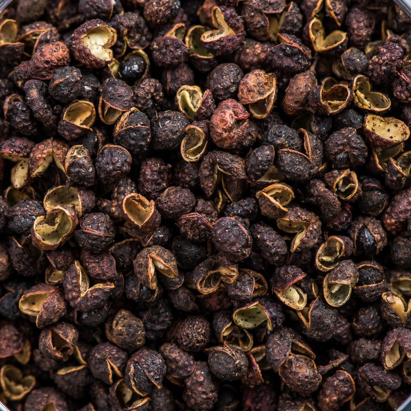 D'origine népalaise, cette baie timut se récolte dans des petits arbres endémiques de l'espèce des Zanthoxylum armatum de la famille des Rustacées.