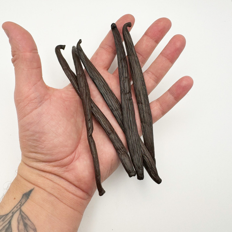 Cultivées de manière raisonnée en Polynésie française, les espèces de vanille Tahitensis Tahiti sont récoltées à maturité sur vigne, lavées et séchées, avant d'être exposées au soleil quelques heures chaque jour pendant au moins 5 mois. Les gousses sont ensuite massées, calibrées et affinées avec une grande expertise. C'est pourquoi les espèces de vanille Tahitensis de Polynésie sont si réputées pour leurs arômes exceptionnels et leurs saveurs uniques, les distinguant de la variété Vanilla planifolia plus connue.