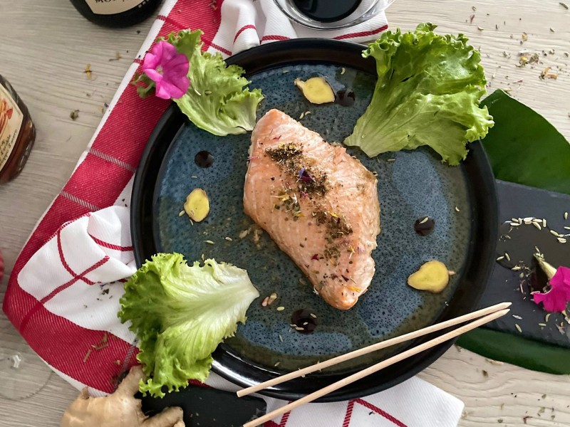 - Dresser le saumon sur une assiette, accompagné de riz ou de crudités.