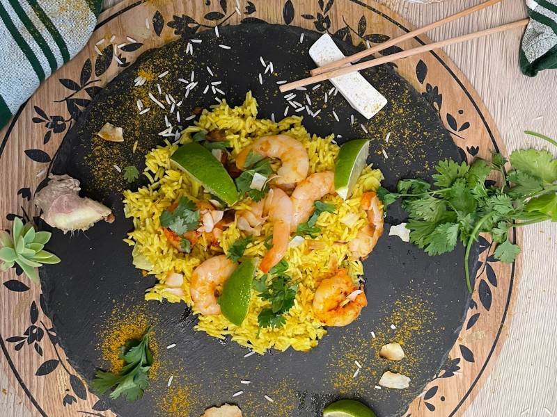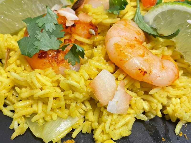 Riz au Yellow Vibration, crevettes et noix de coco